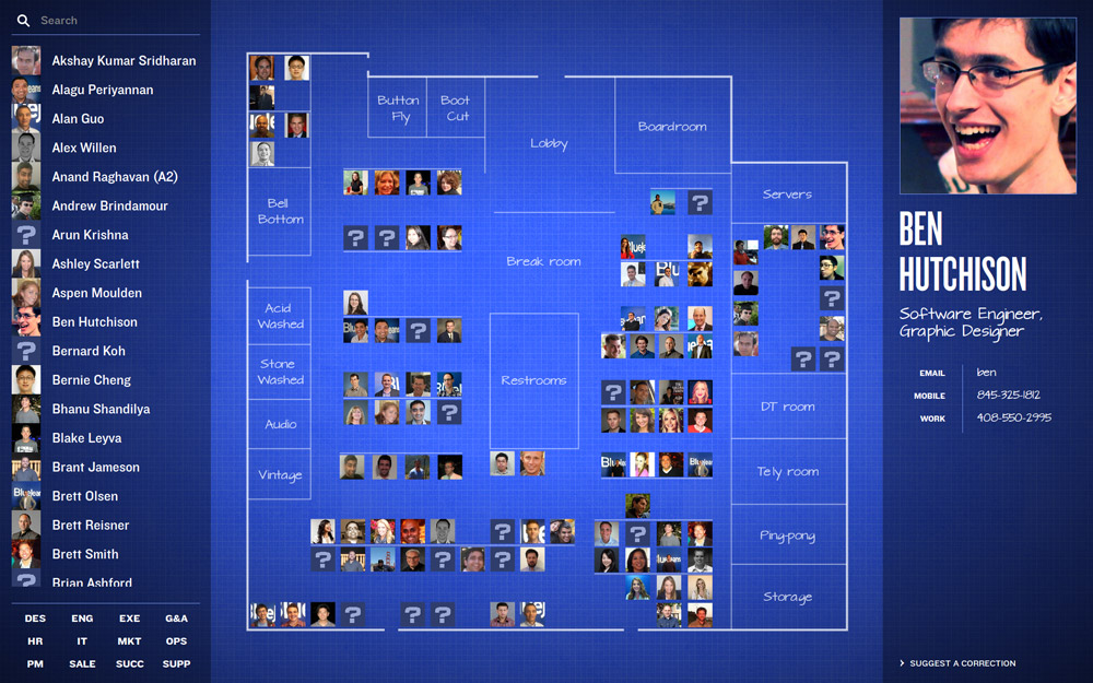 Where do people sit in the offices of Blue Jeans Network? What's that person's name, whose face I remember but never really met? I've heard of this person, but I don't know their face. Where are the different teams grouped? What is A2's email address?
