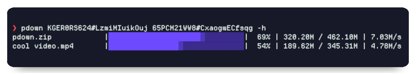 $ pdown YXNRS51SXM#lvWyeftvX7R7 -o ~/Downloads