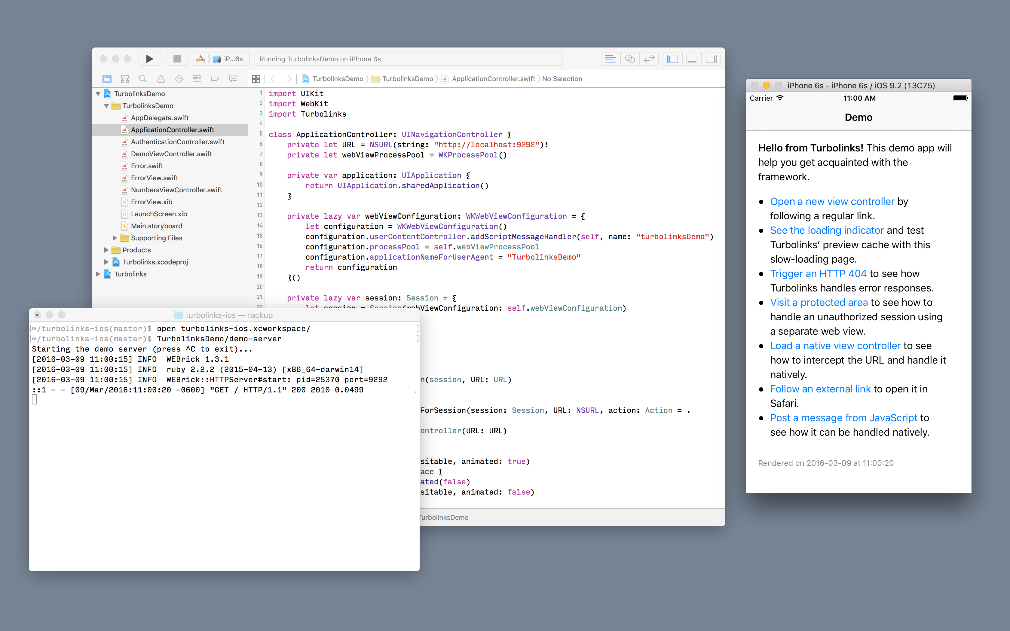 Once you’ve started the demo server, explore the demo application in the Simulator by opening turbolinks-ios.xcworkspace and running the TurbolinksDemo target.