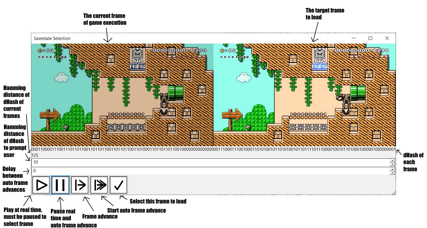 The savestates in use in this application are designed to overcome the technical limitations of a lack of true savestates, where the state of the game is saved to a file to be reloaded. Instead, the system depends on detecting similarity between the framebuffers, or screenshot of the game.