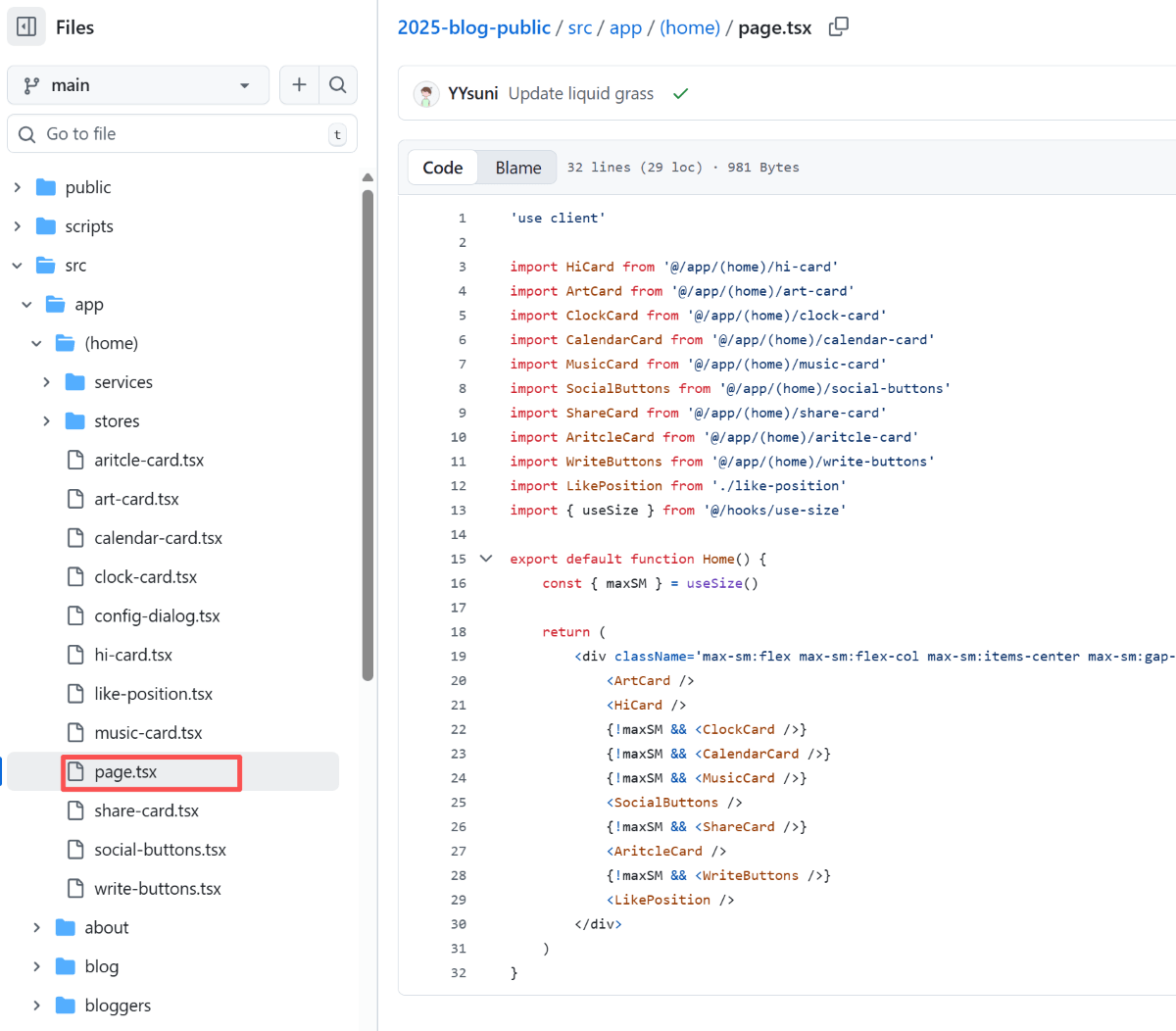 <LiquidGrass /> // 第 53 行首页的内容现在只能前端配置一部分,所以代码更改在 src/app/(home) 目录,这个目录代表首页所有文件。首页的具体文件为 src/app/(home)/page.tsx