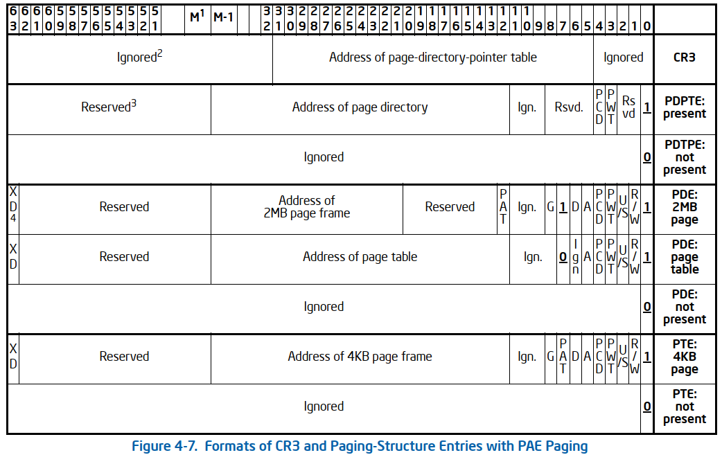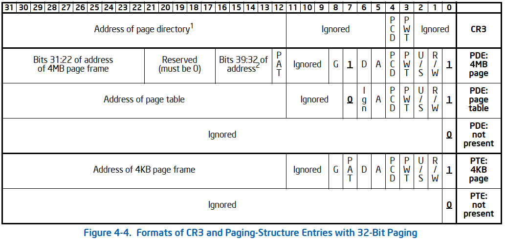 CR4.PAE = CR4.PSE = 0. The translation of a 32-bit linear address then operates as follows:- Bits 31:22 of the linear address select an entry in the guest page directory located at the guest-physical address in CR3. The guest-physical address of the guest page-directory entry (PDE) is translated through EPT to determine the guest PDE’s physical address.