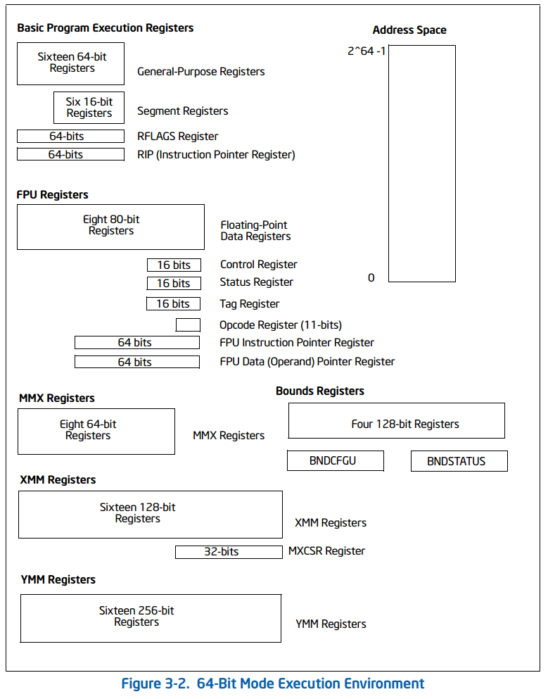 - In 64-bits mode: GPR and SIMD registers extends from 8 to 16 + GPR are widened to 64 bits.