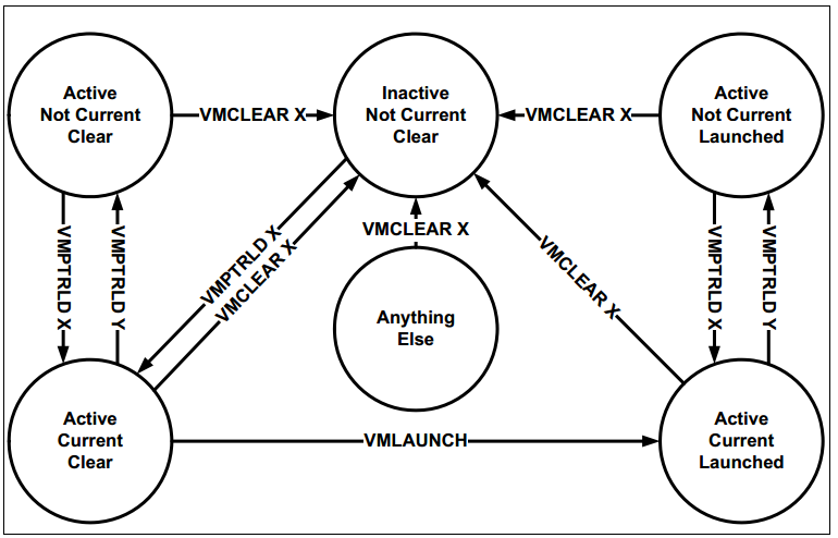 - VMCLEAR — This instruction takes a single 64-bit operand that is in memory. The instruction sets the launch state of the VMCS referenced by the operand to “clear”, renders that VMCS inactive, and ensures that data for the VMCS have been written to the VMCS-data area in the referenced VMCS region. If the operand is the same as the current-VMCS pointer, that pointer is made invalid.