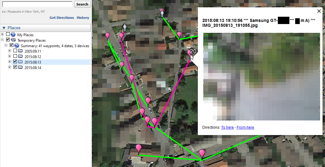 - placemark names contain: "Timestamp | Make Model | Filename";