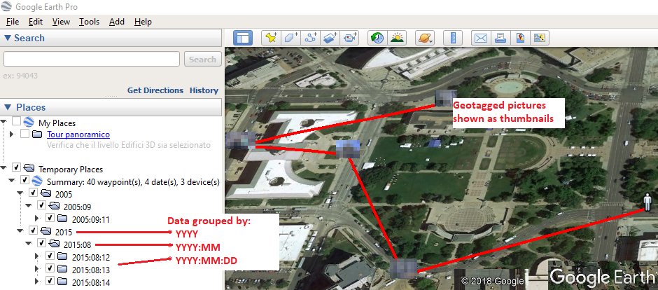 The is a cross-platform script that uses ExifTool to find geotagged files and parse their metadata. It then creates two different Google Earth .KML files to display the photos/videos found.