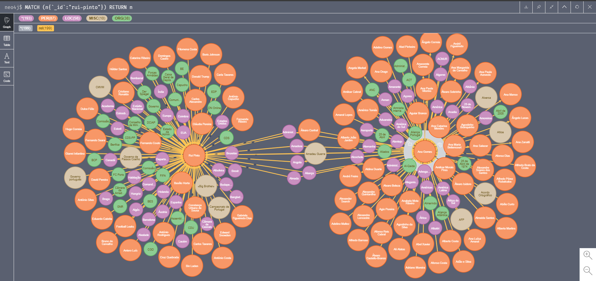 As notícias recolhidas foram analisadas e de lá foram extraídas entidades (pessoas, organizações, lugares, entre outras) e respetivas relações. Estas relações formam uma rede imensa que é agora explorável nesta interface gráfica ou diretamente nos dados que são de livre acesso.