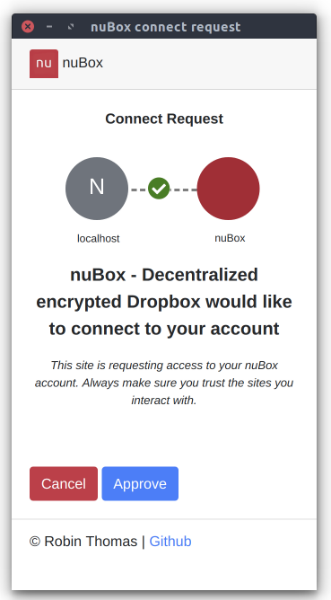 await nuBox.isHostRunning();This API call is used to request permission from the user to start using the nuBox APIs (for this web host). On calling this API, it'll open a popup, like shown below. If user hasn't approved this request, you can only use the isHostRunning API.