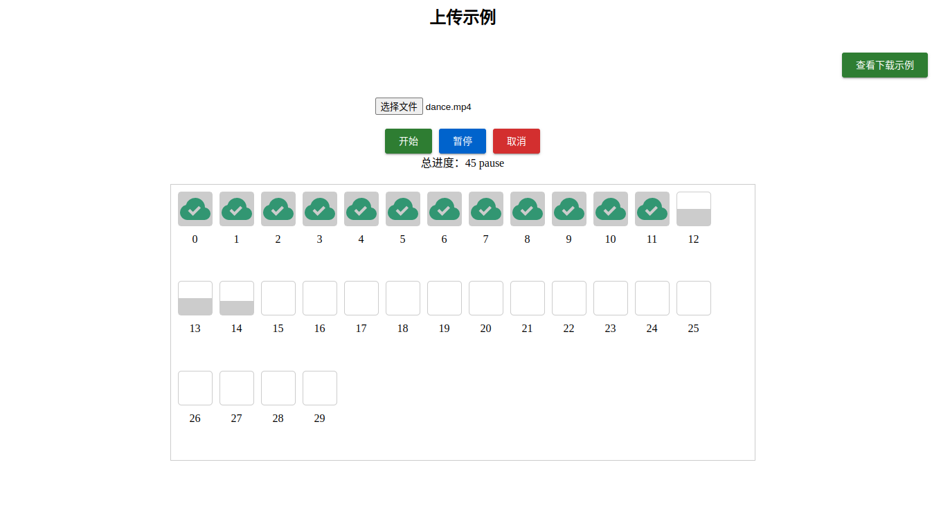- 包括切片上传,秒传,断点续传,暂停、取消。